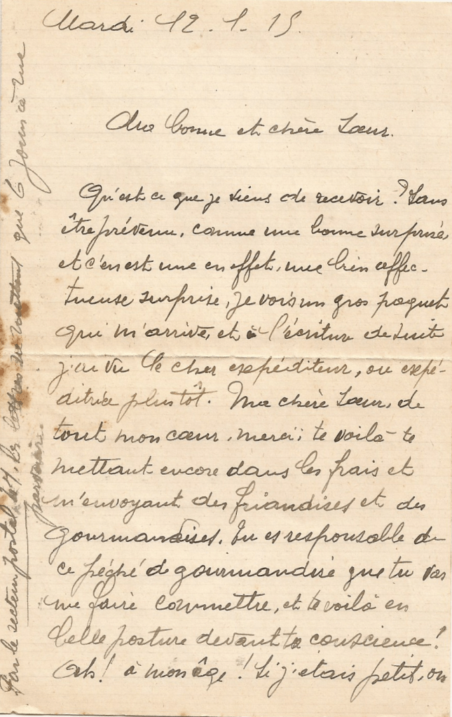 Qu’est-ce que je viens de recevoir ? Sans être prévenu, comme une bonne surprise et c’en est une en effet, une bien affectueuse surprise. Je vois un gros paquet qui m’arrive et à l’écriture de suite j’ai vu le cher expéditeur, ou expéditrice plutôt. Ma chère sœur, de tout mon cœur, merci. Te voilà te mettant encore dans les frais et m’envoyant des friandises et des gourmandises. Tu es responsable de ce péché de gourmandise que tu vas me faire commettre, et te voilà en belle posture devant ta conscience ! Ah ! A mon âge ! Si j’étais petit, on me dirait que mes dents vont tomber : maintenant il faut croire qu’elles sont plus solides. Ah ! Les pastilles surtout me seront utiles et je te reconnais bien là beaucoup maman, sachant avant tout prendre soin de ma santé.