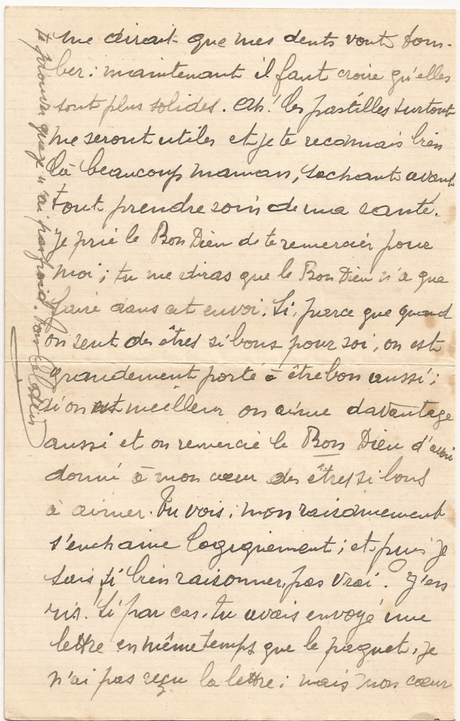 Je prie le Bon Dieu de te remercier pour moi ; tu me diras que le Bon Dieu n’a que faire dans cet envoi. Si, parce que quand on sent des êtres si bons pour soi, on est grandement porté à être bon aussi ; si on est meilleur on aime davantage aussi et on remercie le Bon dieu d’avoir donné à mon cœur des êtres si bons à aimer. Tu vois : mon raisonnement s’enchaîne logiquement ; et puis je sais si bien raisonner, pas vrai ? J’en ris. Si par cas, tu avais envoyé une lettre en même temps que le paquet, je n’ai pas reçu la lettre ; mais mon cœur me dit que c’est une surprise ! Merci aussi tendrement que je puis te le dire. Je ne veux pas te reprocher la dépense, tu me gronderais ; mais je suis bien sûr que tu t’es privée pour moi et que toi tu ne t’es pas payé tout cela. Enfin : je prie le Bon Dieu pour toi.