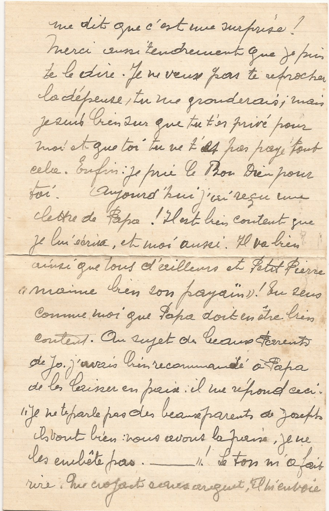 Aujourd’hui j’ai reçu une lettre de papa ! Il est bien content que je lui écrive, et moi aussi. Il va bien ainsi que tous d’ailleurs et Petit Pierre « m’aime bien son payaïn » ! Tu sens comme moi que papa doit en être bien content. Au sujet des beaux parents de Jo, j’avais bien recommandé à Papa de les laisser en paix. Il me répond ceci : « Je ne te parle pas des beaux-parents de Joseph ils vont bien : nous avons la paix, je ne les embête pas. _______ » ! Le ton m’a fait rire.
