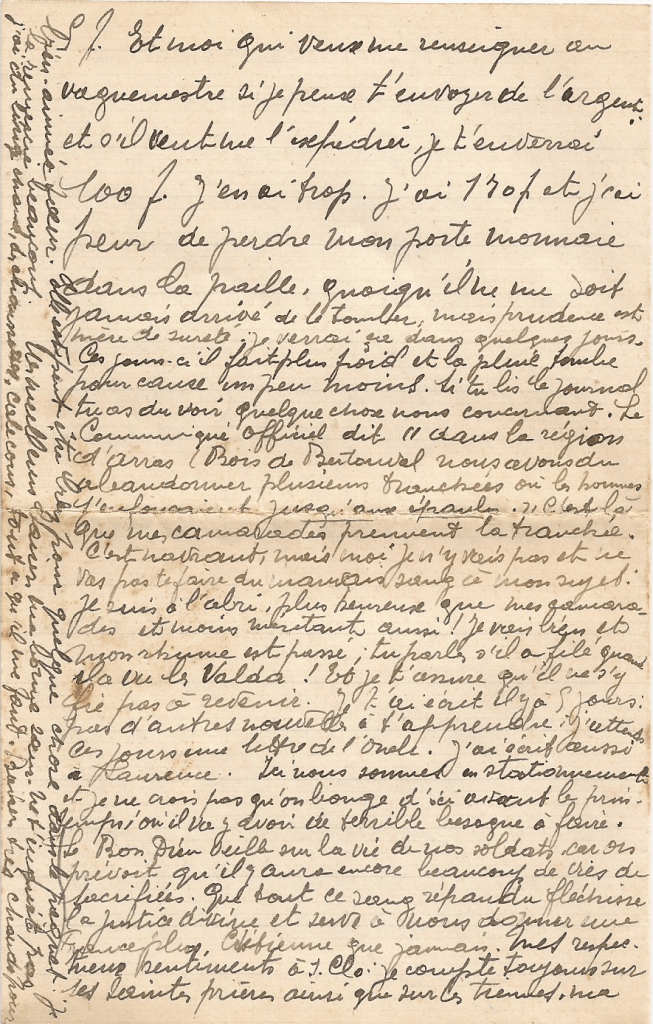 Me croyant sans argent, il m’envoie 5 f. Et moi qui veut me renseigner au vaguemestre si je peux t’envoyer de l’argent et s’il veut me l’expédier, je t’enverrai 100f. J’en ai trop. J’ai 170f et j’ai peur de perdre mon porte-monnaie dans la paille, quoiqu’il ne me soit jamais arrivé de le tomber, mais prudence est mère de sûreté. Je verrai ça dans quelques jours.