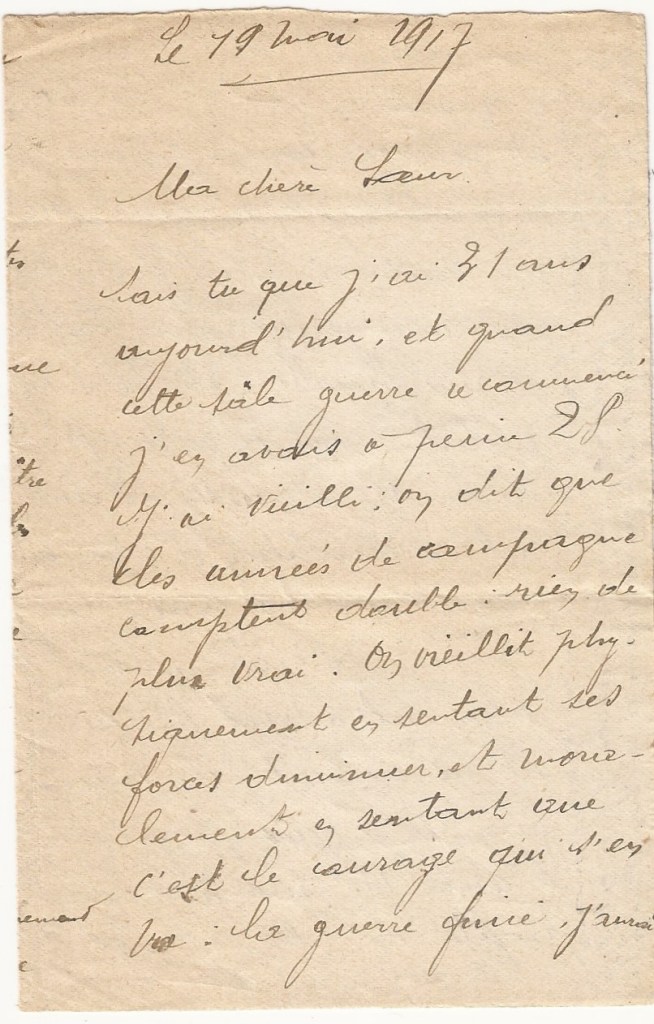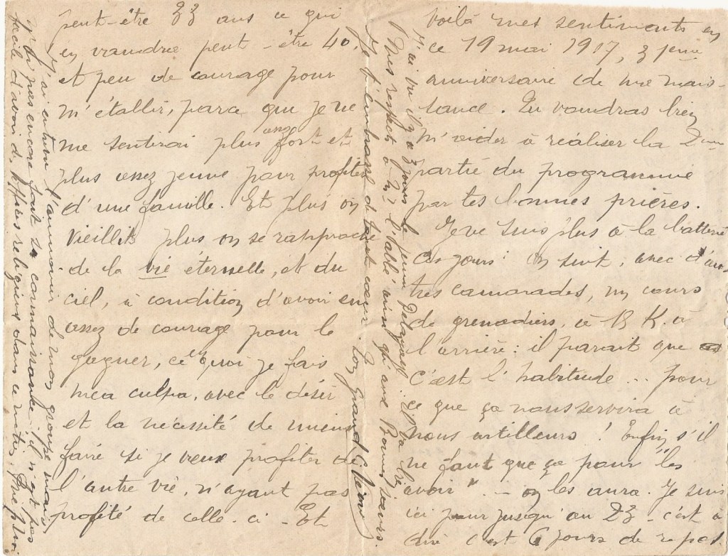 Sais-tu que j’ai 31 ans aujourd’hui, et quand cette sale guerre a commencé j’en avais à peine 28. J’ai vieilli : on dit que les années de campagne comptent double : rien de plus vrai. On vieillit physiquement en sentant ses forces diminuer, et moralement en sentant que c’est le courage qui s’en va : la guerre finie, j’aurai peut-être 33 ans ce qui en vaudra peut-être 40 et peu de courage pour m’établir, parce que je ne me sentirais plus assez fort et plus assez jeune pour profiter d’une famille. Et plus on vieillit, plus on se rapproche de la vie éternelle, et du ciel, à condition d’avoir eu assez de courage pour le gagner, ce en quoi je fais mea culpa, avec le désir et la nécessité de mieux faire si je veux profiter de l’autre vie, n’ayant pas profité de celle-ci. Et voilà mes sentiments en ce 19 mai 1917, 31ème anniversaire de ma naissance. Tu voudras bien m’aider à réaliser la 2ème partie du programme par tes bonnes prières.