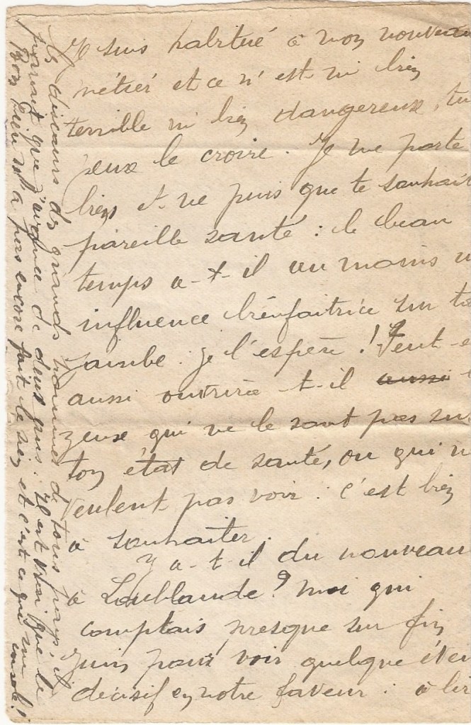 Je ne suis plus à la batterie ces jours : on suit, avec d’autres camarades, un cours de grenadier, à 18K à l’arrière : il paraît que c’est l’habitude… pour ce que ça nous servira à nous artilleurs ! Enfin s’il ne faut que ça pour « les avoir » … on les aura. Je suis ici pour jusqu’au 23. C’est-à-dire c’est 6 jours de repos. Je suis habitué à mon nouveau métier et ce n’est ni bien terrible ni bien dangereux, tu peux le croire. Je me porte bien et ne puis que te souhaiter pareille santé : le beau temps a-t-il au moins une influence bienfaitrice sur ta jambe : je l’espère ! Peut-être aussi ouvrira-t-il les yeux qui ne le sont pas sur ton état de santé, ou qui ne veulent pas voir : c’est bien à souhaiter.