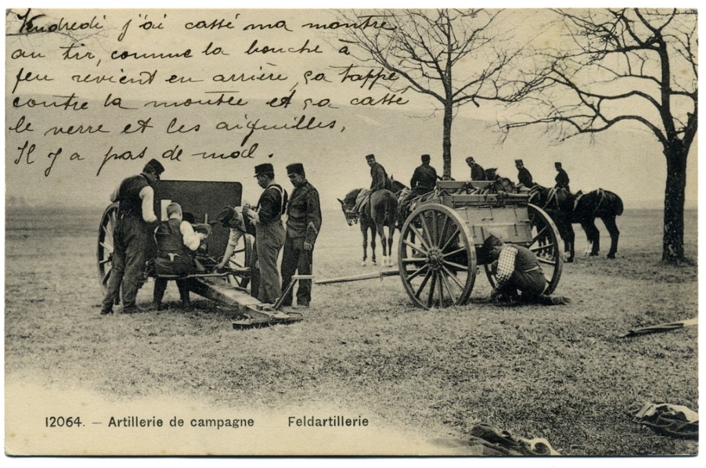 Pour finir, les aléas de la vie d’un artilleur, datant de 1912 (on sent qu’il n’y a pas la même pression ; il s’agit d’ailleurs de l’armée suisse… d’où l’importance de la montre ?) :