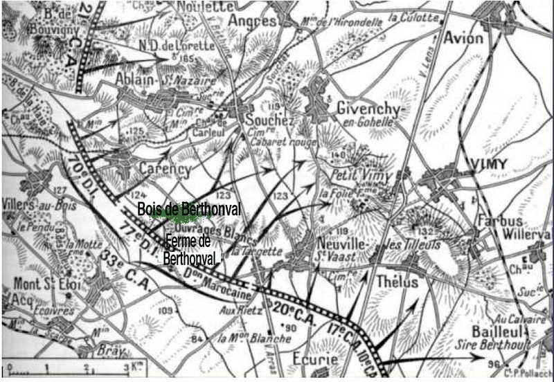 Lorsque Célestin indique qu’il est toujours au même endroit, il s’agit du secteur de la Ferme Berthonval. C’est là qu’il est arrivé lorsqu’il a rejoint le Front, le 9 novembre 1914. Fin avril 1915, il n’a pas bougé. Son régiment occupe la ferme et les tranchées sont près, à la lisière du bois de Berthonval. La carte ci-dessous montre les positions françaises (le régiment de Célestin, le 159e RI fait partie de la 77e Division d’Infanterie) en cette fin avril. Lorsque Célestin indique qu’il va aller à l’arrière quelques jours, il se rend dans le village d’Acq, qu’on identifie dans l’angle en bas à gauche de la carte, à moins de 5 kilomètres.