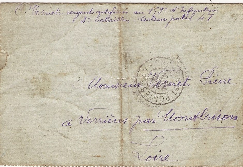 J’ai reçu hier soir la lettre de Joseph. J’étais inquiet car je n’avais pas de vos nouvelles depuis le 4 Avril, et c’est un peu long, d’autant plus que je pensais que Laurence m’aurait écrit de Verrières. Enfin vous n’êtes pas malades, c’est l’essentiel ; la nouvelle de la mort de la pauvre mère Coste m’a bien fait de la peine ; j’aurais bien voulu la revoir, et je plains beaucoup le pauvre père Mathieu qui doit faire peine à voir. Dis lui bien, mon cher Papa, que je prends bien part à sa douleur et que je prierai pour la chère défunte. Nous sommes toujours au même endroit, mais dans deux jours nous allons à l’arrière au repos pour une huitaine de jours ; moi je ne suis pas fatigué car je ne travaille pas trop et mon hiver n’a pas été dur. Je vais tout à fait bien et quoique je paraisse maigre sur la photo, je ne me porte pas mal et suis plus gras que je ne parais. J’ai maintenant fait raser mon « bouc » qui n’était d’ailleurs pas bien gros : ça ne se connaît pas. Je n’ai pas besoin du tout d’argent, gagnant 34 sous par jour et que Joseph se garde bien de m’en envoyer. Celà me suffit largement et au-delà, je ne me prive pas et vais bien boire mon litre avec les camarades ; nous payons le vin 12 sous le litre, mais sans être mauvais ce n’est pas de la 1ère qualité. Hier, mon cher Papa, j’ai eu une visite qui m’a fait bien plaisir, celle d’un petit Laurent, de Chante-Perdrix, commune d’Essertines, un cousin bien gentil, dégourdi, débrouillard, un petit « poilu » qui n’a pas froid aux yeux et courageux tout plein. Il est bien vu à sa compagnie et de ses chefs et de ses camarades, et il le mérite car il est tout à fait gentil et n’a pas peur des Boches, un vrai petit Français et bien chrétien aussi. Je ne le connaissais pas, ni lui non plus, et tous les deux nous avons été bien contents de nous voir ; nous sommes restés hier ensemble une partie de la journée et je dois le revoir aujourd’hui ; nous parlons patois. Il est au 97e et c’est sa mère qui lui a donné mon adresse ; j’ai pensé que c’était toi qui l’avais renseignée. Nous sommes dans le même village, à 100 mètres l’un de l’autre. Ici tout est assez calme, et nous attendons que Joffre nous fasse signe de cogner ces sâles Boches, ce qui ne peut tarder beaucoup. Il fait beau et sec et il y a même une grande bise pas bien chaude. Quelle poussière déjà ! Soigne toi bien mon cher Papa ; je pense bien à toi. Je prie pour toi, t’aime et t’embrasse comme un grand fils. Mes respects à Mr le Curé. J’écrirai à Joseph ; il ne me dit pas s’il a reçu mon colis. Mille baisers. Ton Célestin