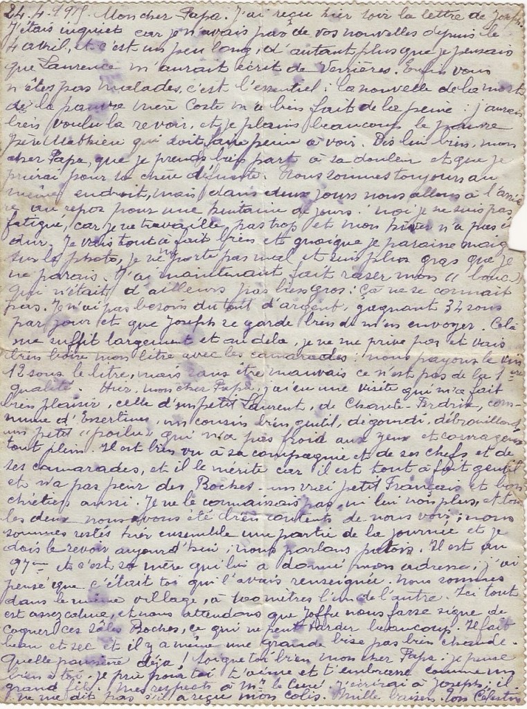 Parmi les 85 lettres retrouvées, elles sont presque toutes adressées à Jeanne. Certaines sont intitulées « Mes chères sœurs », lorsque Jeanne est en compagnie de Mathilde ou de Laurence. Et, il y en a une qui est adressée à son père, le 24 avril 1915. La voici :