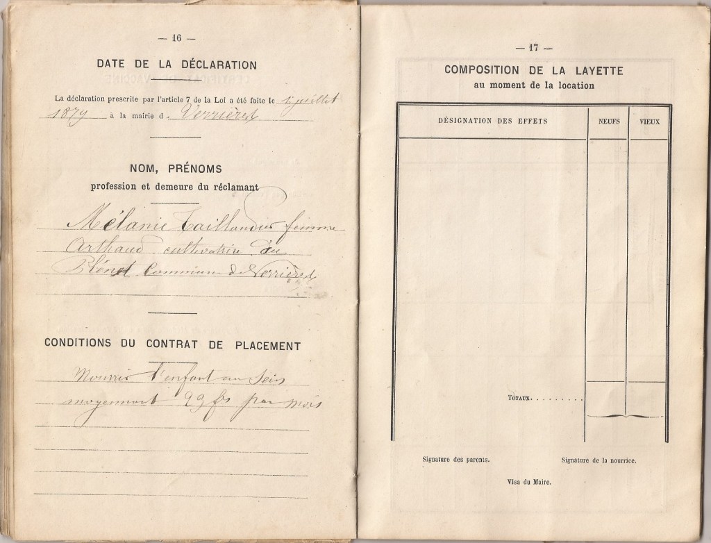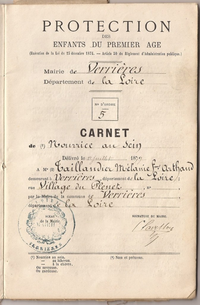 Tout de suite après sa naissance, une voisine du hameau du Pleynet prend la charge de la nourrir au sein. Son « Carnet de Nourrice » a été retrouvé à la mairie de Verrières.
